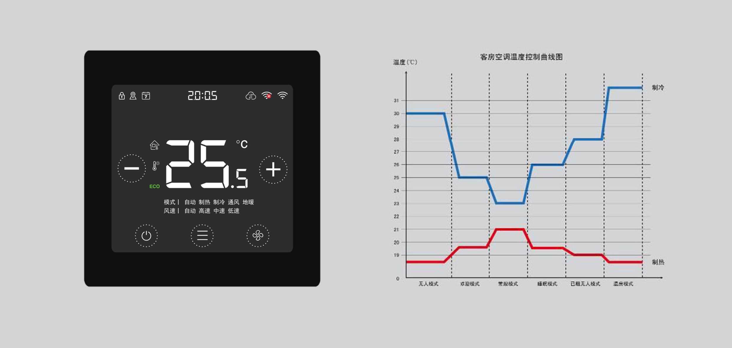 智能系统能够根据酒店客房状态,如是否入住、季节等,及时对客房温度进行合理调节,在不影响客人入住体验的前提下,尽可能节能减排。在不同的控制状态下,空调可设置为:登记模式、欢迎模式、出租外出模式、待租模式、空房模式、手动模式等。