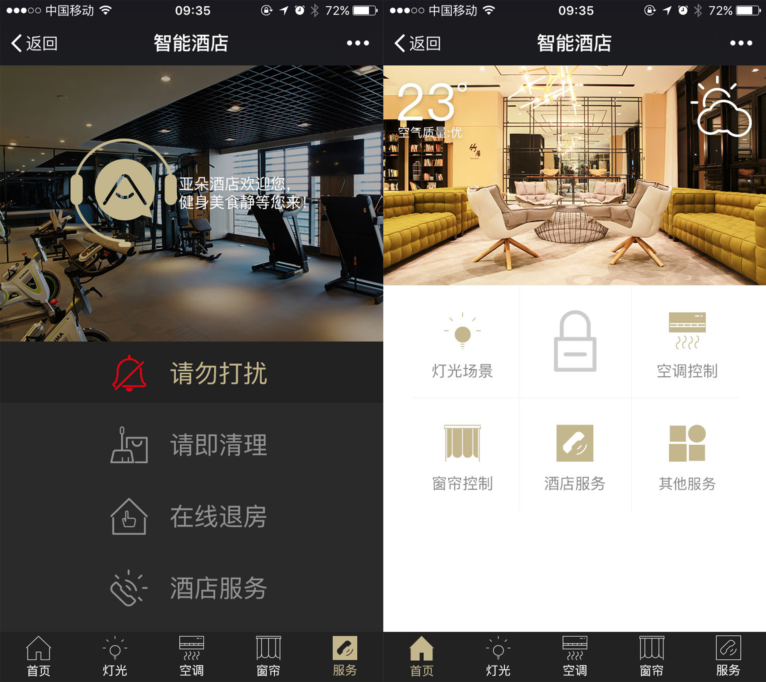 通过客控系统和移动平台物联客房设备、酒店服务,将酒店客房全生态、全场景智能化, 通过手机和语音两种交互方式,享受智慧住宿服务。